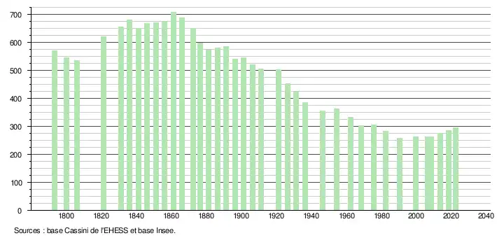 L'évolution du nombre d'habitants est connue à travers les recensements de la population effectués dans la commune depuis 1793. Pour les communes de moins de 10 000 habitants, une enquête de recensement portant sur toute la population est réalisée tous les cinq ans, les populations de référence des années intermédiaires étant quant à elles estimées par interpolation ou extrapolation[30]. Pour la commune, le premier recensement exhaustif entrant dans le cadre du nouveau dispositif a été réalisé en 2008[31].