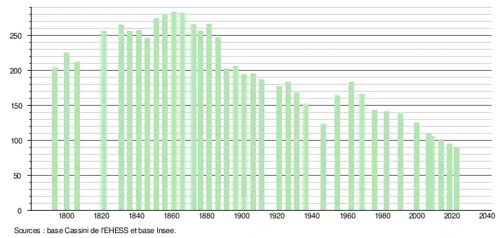 L'évolution du nombre d'habitants est connue à travers les recensements de la population effectués dans la commune depuis 1793. Pour les communes de moins de 10 000 habitants, une enquête de recensement portant sur toute la population est réalisée tous les cinq ans, les populations de référence des années intermédiaires étant quant à elles estimées par interpolation ou extrapolation[17]. Pour la commune, le premier recensement exhaustif entrant dans le cadre du nouveau dispositif a été réalisé en 2008[18].