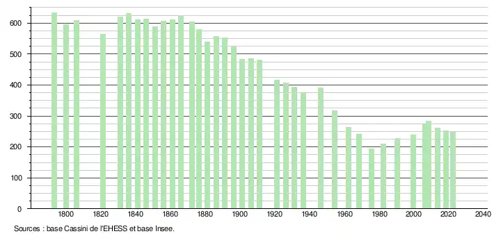L'évolution du nombre d'habitants est connue à travers les recensements de la population effectués dans la commune depuis 1793. Pour les communes de moins de 10 000 habitants, une enquête de recensement portant sur toute la population est réalisée tous les cinq ans, les populations de référence des années intermédiaires étant quant à elles estimées par interpolation ou extrapolation[23]. Pour la commune, le premier recensement exhaustif entrant dans le cadre du nouveau dispositif a été réalisé en 2008[24].