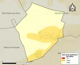 Le retrait-gonflement des sols argileux est susceptible d'engendrer des dommages importants aux bâtiments en cas d’alternance de périodes de sécheresse et de pluie. 31,5 % de la superficie communale est en aléa moyen ou fort (52,8 % au niveau départemental et 48,5 % au niveau national). Sur les 104 bâtiments dénombrés sur la commune en 2019, 103 sont en aléa moyen ou fort, soit 99 %, à comparer aux 70 % au niveau départemental et 54 % au niveau national. Une cartographie de l'exposition du territoire national au retrait gonflement des sols argileux est disponible sur le site du BRGM[17],[Carte 2].