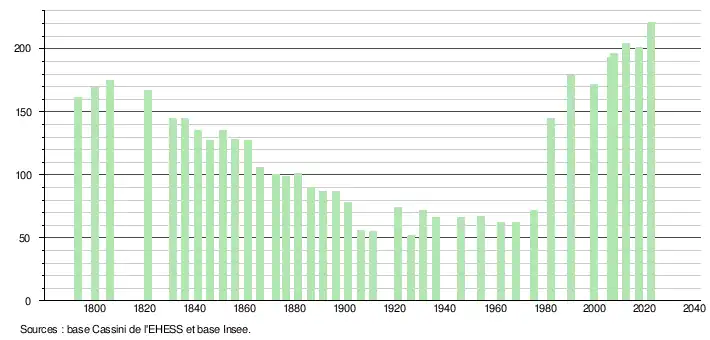 L'évolution du nombre d'habitants est connue à travers les recensements de la population effectués dans la commune depuis 1793. Pour les communes de moins de 10 000 habitants, une enquête de recensement portant sur toute la population est réalisée tous les cinq ans, les populations de référence des années intermédiaires étant quant à elles estimées par interpolation ou extrapolation[21]. Pour la commune, le premier recensement exhaustif entrant dans le cadre du nouveau dispositif a été réalisé en 2007[22].