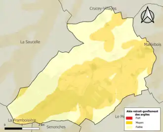 Le retrait-gonflement des sols argileux est susceptible d'engendrer des dommages importants aux bâtiments en cas d’alternance de périodes de sécheresse et de pluie. 57 % de la superficie communale est en aléa moyen ou fort (52,8 % au niveau départemental et 48,5 % au niveau national). Sur les 110 bâtiments dénombrés sur la commune en 2019, 51 sont en aléa moyen ou fort, soit 46 %, à comparer aux 70 % au niveau départemental et 54 % au niveau national. Une cartographie de l'exposition du territoire national au retrait gonflement des sols argileux est disponible sur le site du BRGM[15],[Carte 2].