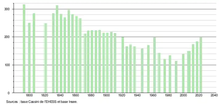 L'évolution du nombre d'habitants est connue à travers les recensements de la population effectués dans la commune depuis 1793. Pour les communes de moins de 10 000 habitants, une enquête de recensement portant sur toute la population est réalisée tous les cinq ans, les populations de référence des années intermédiaires étant quant à elles estimées par interpolation ou extrapolation[19]. Pour la commune, le premier recensement exhaustif entrant dans le cadre du nouveau dispositif a été réalisé en 2007[20].