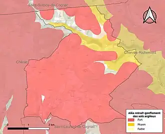 Le retrait-gonflement des sols argileux est susceptible d'engendrer des dommages importants aux bâtiments en cas d’alternance de périodes de sécheresse et de pluie. 93,5 % de la superficie communale est en aléa moyen ou fort (67,4 % au niveau départemental et 48,5 % au niveau national). Sur les 452 bâtiments dénombrés sur la commune en 2019, 428 sont en aléa moyen ou fort, soit 95 %, à comparer aux 81 % au niveau départemental et 54 % au niveau national. Une cartographie de l'exposition du territoire national au retrait gonflement des sols argileux est disponible sur le site du BRGM[21],[Carte 3].