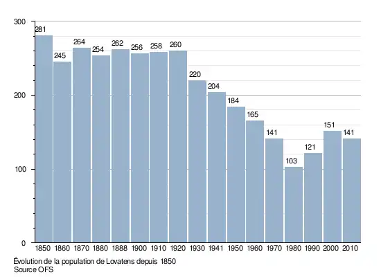 La population de Lovatens est de 281 personnes en 1850. Elle reste relativement stable jusqu'en 1920. Le nombre d'habitants baisse ensuite jusqu'à 103 en 1980 avant de remonter à 151 en 2000. Le graphique suivant résume l'évolution de la population de Lovatens entre 1850 et 2010[8] :