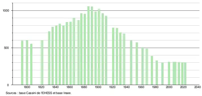L'évolution du nombre d'habitants est connue à travers les recensements de la population effectués dans la commune depuis 1793. Pour les communes de moins de 10 000 habitants, une enquête de recensement portant sur toute la population est réalisée tous les cinq ans, les populations de référence des années intermédiaires étant quant à elles estimées par interpolation ou extrapolation[22]. Pour la commune, le premier recensement exhaustif entrant dans le cadre du nouveau dispositif a été réalisé en 2008[23].