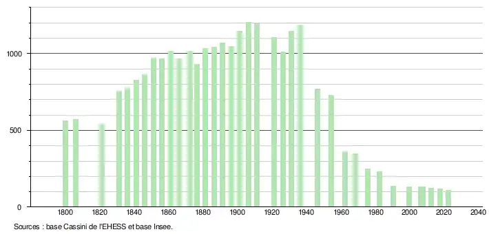 L'évolution du nombre d'habitants est connue à travers les recensements de la population effectués dans la commune depuis 1800. Pour les communes de moins de 10000habitants, une enquête de recensement portant sur toute la population est réalisée tous les cinqans, les populations de référence des années intermédiaires étant quant à elles estimées par interpolation ou extrapolation[17]. Pour la commune, le premier recensement exhaustif entrant dans le cadre du nouveau dispositif a été réalisé en 2007[18].