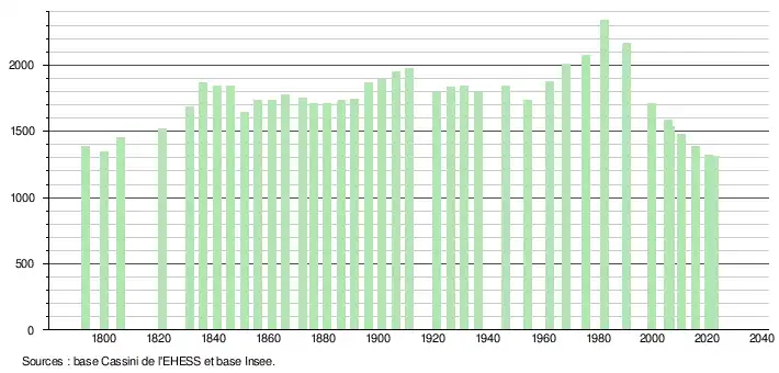 L'évolution du nombre d'habitants est connue à travers les recensements de la population effectués dans la commune depuis 1793. Pour les communes de moins de 10 000 habitants, une enquête de recensement portant sur toute la population est réalisée tous les cinq ans, les populations de référence des années intermédiaires étant quant à elles estimées par interpolation ou extrapolation[31]. Pour la commune, le premier recensement exhaustif entrant dans le cadre du nouveau dispositif a été réalisé en 2005[32].