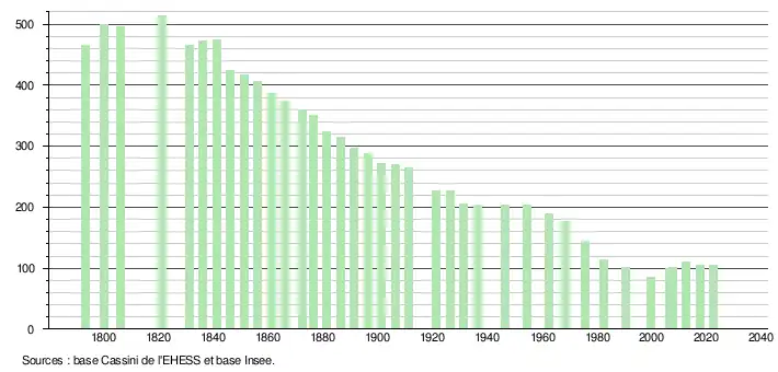 L'évolution du nombre d'habitants est connue à travers les recensements de la population effectués dans la commune depuis 1793. Pour les communes de moins de 10 000 habitants, une enquête de recensement portant sur toute la population est réalisée tous les cinq ans, les populations de référence des années intermédiaires étant quant à elles estimées par interpolation ou extrapolation[14]. Pour la commune, le premier recensement exhaustif entrant dans le cadre du nouveau dispositif a été réalisé en 2007[15].
