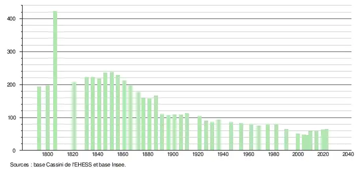 L'évolution du nombre d'habitants est connue à travers les recensements de la population effectués dans la commune depuis 1793. Pour les communes de moins de 10 000 habitants, une enquête de recensement portant sur toute la population est réalisée tous les cinq ans, les populations de référence des années intermédiaires étant quant à elles estimées par interpolation ou extrapolation[34]. Pour la commune, le premier recensement exhaustif entrant dans le cadre du nouveau dispositif a été réalisé en 2004[35].