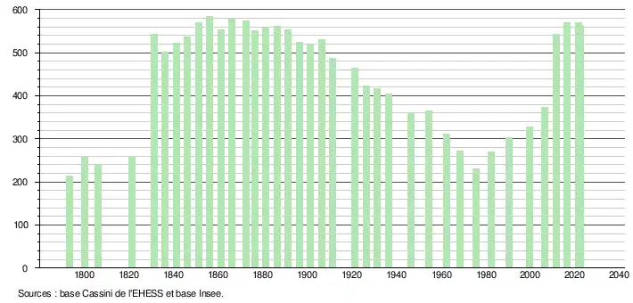 | L'évolution du nombre d'habitants est connue à travers les recensements de la population effectués dans la commune depuis 1793. Pour les communes de moins de 10 000 habitants, une enquête de recensement portant sur toute la population est réalisée tous les cinq ans, les populations de référence des années intermédiaires étant quant à elles estimées par interpolation ou extrapolation[27]. Pour la commune, le premier recensement exhaustif entrant dans le cadre du nouveau dispositif a été réalisé en 2006[28]. En 2022, la commune comptait 564 habitants[Note 2], en évolution de −1,23 % par rapport à 2016 (Landes : +5,78 %, France hors Mayotte : +2,11 %). |