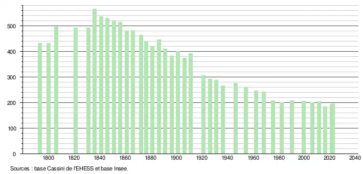 L'évolution du nombre d'habitants est connue à travers les recensements de la population effectués dans la commune depuis 1793. Pour les communes de moins de 10 000 habitants, une enquête de recensement portant sur toute la population est réalisée tous les cinq ans, les populations de référence des années intermédiaires étant quant à elles estimées par interpolation ou extrapolation[13]. Pour la commune, le premier recensement exhaustif entrant dans le cadre du nouveau dispositif a été réalisé en 2006[14].