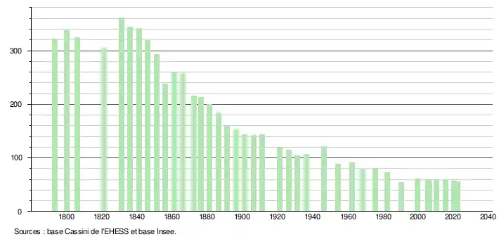 L'évolution du nombre d'habitants est connue à travers les recensements de la population effectués dans la commune depuis 1793. Pour les communes de moins de 10 000 habitants, une enquête de recensement portant sur toute la population est réalisée tous les cinq ans, les populations de référence des années intermédiaires étant quant à elles estimées par interpolation ou extrapolation[14]. Pour la commune, le premier recensement exhaustif entrant dans le cadre du nouveau dispositif a été réalisé en 2005[15].
