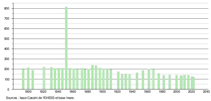 L'évolution du nombre d'habitants est connue à travers les recensements de la population effectués dans la commune depuis 1793. Pour les communes de moins de 10 000 habitants, une enquête de recensement portant sur toute la population est réalisée tous les cinq ans, les populations de référence des années intermédiaires étant quant à elles estimées par interpolation ou extrapolation[23]. Pour la commune, le premier recensement exhaustif entrant dans le cadre du nouveau dispositif a été réalisé en 2005[24].