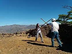 - « pelearon por mas de tres horas viniendo unos y volviendo otros, estrecharonse con fuertes palos y varas de punta del palo mui recias y tostadas : ils vont lutter plus des trois heures en allant et tournant, affrontant avec forts bâtons et verges en point très gros et grillés. »