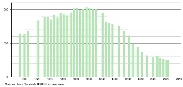 L'évolution du nombre d'habitants est connue à travers les recensements de la population effectués dans la commune depuis 1793. Pour les communes de moins de 10 000 habitants, une enquête de recensement portant sur toute la population est réalisée tous les cinq ans, les populations de référence des années intermédiaires étant quant à elles estimées par interpolation ou extrapolation[25]. Pour la commune, le premier recensement exhaustif entrant dans le cadre du nouveau dispositif a été réalisé en 2005[26].
