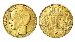 Lucien Bazor grave aussi la pièce de 100 francs en or, millésimée 1935 et 1937, d'un poids de 6,55 g et au module de l'ancienne pièce de 20 francs-or. Frappée à environ 14 millions d'exemplaires, elle ne fut, du fait de la crise économique, pas mise en circulation puis refondue ; très peu d'exemplaires ont réchappé et cette pièce de monnaie est considérée comme extrêmement rare.