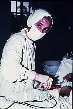 Ces interventions, déjà nombreuses, se font alors encore plus fréquentes à cause de la guerre, du brigandage et de la flambée des violences entre les Acholis et d'autres groupes ethniques du nord comme les Kakwas, les Lugbaras et les Madis[63]. Des militaires mais aussi des civils, souvent blessés par balles, sont soignés à l'hôpital, qui fonctionne malgré tout à plein régime[62]. Ces blessures, causées par les munitions explosives employées par les militaires, s'avèrent spécialement difficiles à opérer à cause des nombreux éclats d'os[62]. C'est durant une de ces délicates interventions que Lucille, devenue chirurgienne de guerre, contracte le VIH[64], virus encore méconnu qui progressait rapidement en Ouganda, à la faveur des combats et des déplacements de population[65].