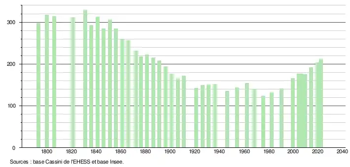 L'évolution du nombre d'habitants est connue à travers les recensements de la population effectués dans la commune depuis 1793. Pour les communes de moins de 10 000 habitants, une enquête de recensement portant sur toute la population est réalisée tous les cinq ans, les populations de référence des années intermédiaires étant quant à elles estimées par interpolation ou extrapolation[19]. Pour la commune, le premier recensement exhaustif entrant dans le cadre du nouveau dispositif a été réalisé en 2004[20].