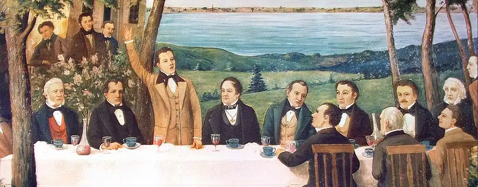 Une importante crise constitutionnelle éclate en 1827, au moment où Duvernay achète La Minerve[35]. L'imprimeur se lance donc dans l'arène avec son journal, défendant les positions du Parti canadien dans les pages du journal montréalais. Les députés patriotes réclament le droit de contrôler l'ensemble des dépenses publiques, ce que le gouverneur Dalhousie leur refuse.