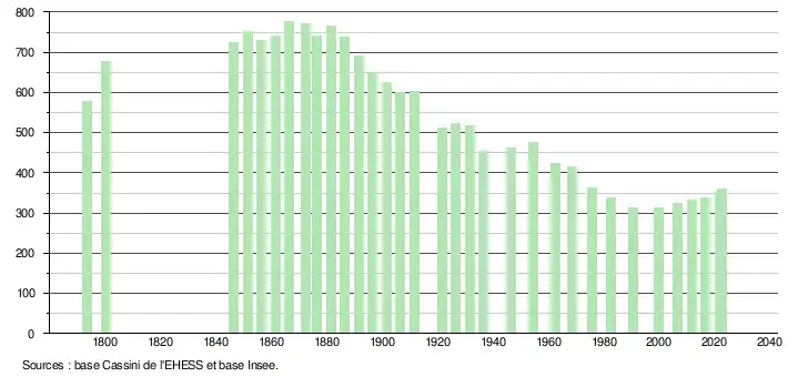 L'évolution du nombre d'habitants est connue à travers les recensements de la population effectués dans la commune depuis 1793. Pour les communes de moins de 10 000 habitants, une enquête de recensement portant sur toute la population est réalisée tous les cinq ans, les populations de référence des années intermédiaires étant quant à elles estimées par interpolation ou extrapolation[43]. Pour la commune, le premier recensement exhaustif entrant dans le cadre du nouveau dispositif a été réalisé en 2006[44].