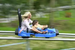 La différence réside dans le fait que les luges sont ici placées sur des rails de type montagnes russes et ne peuvent donc pas quitter la piste. Cela permet des vitesses légèrement plus élevées et surtout, plus de sécurité dans les virages. De plus, les rails étant surélevés, les luges sur rail sont aussi exploitables en hiver.
