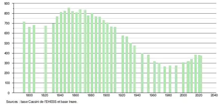 L'évolution du nombre d'habitants est connue à travers les recensements de la population effectués dans la commune depuis 1793. Pour les communes de moins de 10 000 habitants, une enquête de recensement portant sur toute la population est réalisée tous les cinq ans, les populations de référence des années intermédiaires étant quant à elles estimées par interpolation ou extrapolation[22]. Pour la commune, le premier recensement exhaustif entrant dans le cadre du nouveau dispositif a été réalisé en 2005[23].