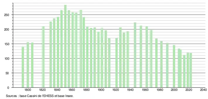 L'évolution du nombre d'habitants est connue à travers les recensements de la population effectués dans la commune depuis 1793. Pour les communes de moins de 10 000 habitants, une enquête de recensement portant sur toute la population est réalisée tous les cinq ans, les populations de référence des années intermédiaires étant quant à elles estimées par interpolation ou extrapolation[24]. Pour la commune, le premier recensement exhaustif entrant dans le cadre du nouveau dispositif a été réalisé en 2008[25].