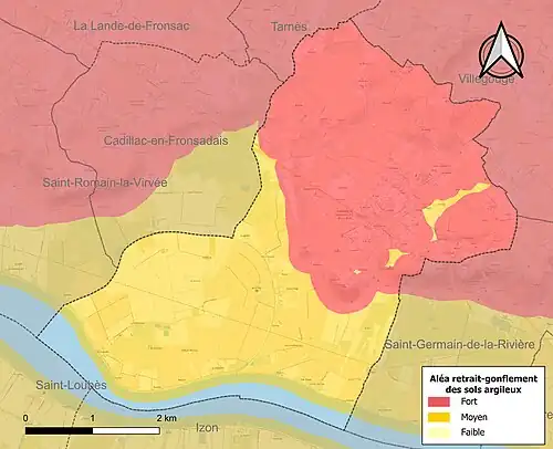Le retrait-gonflement des sols argileux est susceptible d'engendrer des dommages importants aux bâtiments en cas d’alternance de périodes de sécheresse et de pluie. 94,6 % de la superficie communale est en aléa moyen ou fort (67,4 % au niveau départemental et 48,5 % au niveau national). Sur les 559 bâtiments dénombrés sur la commune en 2019, 559 sont en aléa moyen ou fort, soit 100 %, à comparer aux 84 % au niveau départemental et 54 % au niveau national. Une cartographie de l'exposition du territoire national au retrait gonflement des sols argileux est disponible sur le site du BRGM[27],[Carte 2].