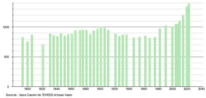 L'évolution du nombre d'habitants est connue à travers les recensements de la population effectués dans la commune depuis 1793. Pour les communes de moins de 10 000 habitants, une enquête de recensement portant sur toute la population est réalisée tous les cinq ans, les populations de référence des années intermédiaires étant quant à elles estimées par interpolation ou extrapolation[34]. Pour la commune, le premier recensement exhaustif entrant dans le cadre du nouveau dispositif a été réalisé en 2004[35].