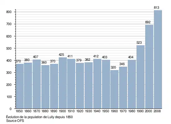 Le graphique suivant résume l'évolution de la population de Lully (incluant les communes fusionnées ultérieurement) entre 1850 et 2008[4] :