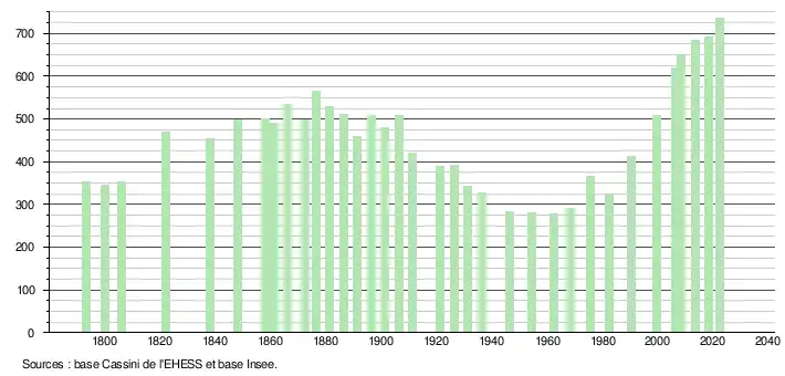 L'évolution du nombre d'habitants est connue à travers les recensements de la population effectués dans la commune depuis 1793. Pour les communes de moins de 10 000 habitants, une enquête de recensement portant sur toute la population est réalisée tous les cinq ans, les populations de référence des années intermédiaires étant quant à elles estimées par interpolation ou extrapolation[13]. Pour la commune, le premier recensement exhaustif entrant dans le cadre du nouveau dispositif a été réalisé en 2008[14].