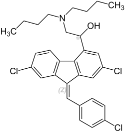 La luméfantrine est un médicament antipaludique destiné à traiter les cas de paludisme à Plasmodium falciparum non compliqué[2]. Elle est toujours utilisée en association fixe avec l'artéméther dans un rapport artéméther/luméfantrine de 1:6, les monothérapies à la luméfantrine n'étant approuvées nulle part dans le monde. De nature liposoluble, son absorption est favorisée par la prise pendant un repas riche en lipides.