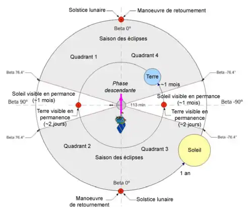 Du point de vue LRO (orbite en violet), la Terre et le Soleil se présentent sous un angle qui revient tous les mois pour la première et tous les ans pour le second (β). Cette situation génère des périodes de visibilité continue de la Terre et du Soleil présentées sur ce schéma.