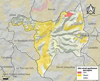 La commune est vulnérable au risque de mouvements de terrains constitué principalement du retrait-gonflement des sols argileux[21]. Cet aléa est susceptible d'engendrer des dommages importants aux bâtiments en cas d’alternance de périodes de sécheresse et de pluie. 35,1 % de la superficie communale est en aléa moyen ou fort (59,3 % au niveau départemental et 48,5 % au niveau national). Sur les 494 bâtiments dénombrés sur la commune en 2019, 427 sont en aléa moyen ou fort, soit 86 %, à comparer aux 85 % au niveau départemental et 54 % au niveau national. Une cartographie de l'exposition du territoire national au retrait gonflement des sols argileux est disponible sur le site du BRGM[22],[Carte 2].