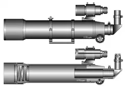 Lunette astronomique équipée d'un chercheur et d'un appareil photographique à grande focale sur le même axe.