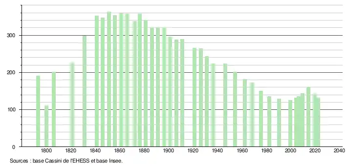 L'évolution du nombre d'habitants est connue à travers les recensements de la population effectués dans la commune depuis 1793. Pour les communes de moins de 10 000 habitants, une enquête de recensement portant sur toute la population est réalisée tous les cinq ans, les populations de référence des années intermédiaires étant quant à elles estimées par interpolation ou extrapolation[23]. Pour la commune, le premier recensement exhaustif entrant dans le cadre du nouveau dispositif a été réalisé en 2004[24].