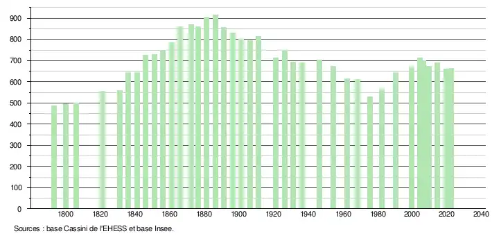 L'évolution du nombre d'habitants est connue à travers les recensements de la population effectués dans la commune depuis 1793. Pour les communes de moins de 10 000 habitants, une enquête de recensement portant sur toute la population est réalisée tous les cinq ans, les populations de référence des années intermédiaires étant quant à elles estimées par interpolation ou extrapolation[21]. Pour la commune, le premier recensement exhaustif entrant dans le cadre du nouveau dispositif a été réalisé en 2004[22].