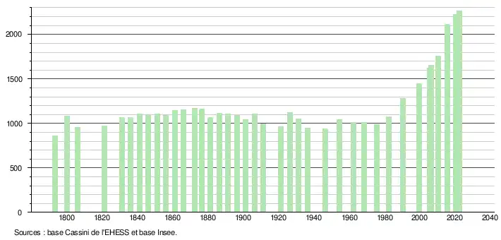 L'évolution du nombre d'habitants est connue à travers les recensements de la population effectués dans la commune depuis 1793. Pour les communes de moins de 10 000 habitants, une enquête de recensement portant sur toute la population est réalisée tous les cinq ans, les populations de référence des années intermédiaires étant quant à elles estimées par interpolation ou extrapolation[24]. Pour la commune, le premier recensement exhaustif entrant dans le cadre du nouveau dispositif a été réalisé en 2005[25].