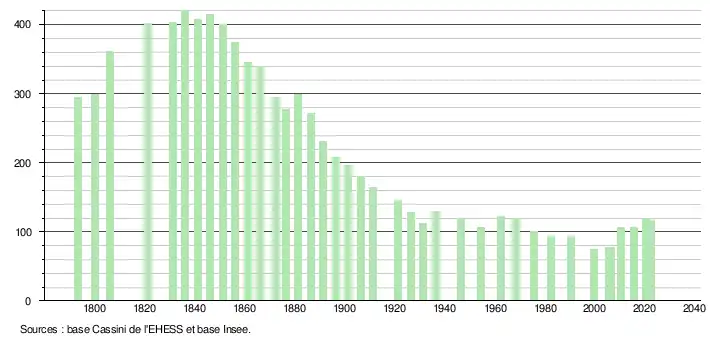 L'évolution du nombre d'habitants est connue à travers les recensements de la population effectués dans la commune depuis 1793. Pour les communes de moins de 10 000 habitants, une enquête de recensement portant sur toute la population est réalisée tous les cinq ans, les populations de référence des années intermédiaires étant quant à elles estimées par interpolation ou extrapolation[12]. Pour la commune, le premier recensement exhaustif entrant dans le cadre du nouveau dispositif a été réalisé en 2005[13].