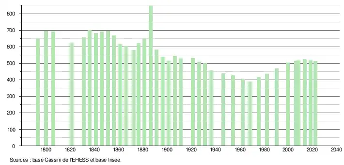 L'évolution du nombre d'habitants est connue à travers les recensements de la population effectués dans la commune depuis 1793. Pour les communes de moins de 10 000 habitants, une enquête de recensement portant sur toute la population est réalisée tous les cinq ans, les populations de référence des années intermédiaires étant quant à elles estimées par interpolation ou extrapolation[16]. Pour la commune, le premier recensement exhaustif entrant dans le cadre du nouveau dispositif a été réalisé en 2008[17].