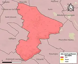 Le retrait-gonflement des sols argileux est susceptible d'engendrer des dommages importants aux bâtiments en cas d’alternance de périodes de sécheresse et de pluie. La totalité de la commune est en aléa moyen ou fort (88,8 % au niveau départemental et 48,5 % au niveau national). Sur les 119 bâtiments dénombrés sur la commune en 2019, 119 sont en aléa moyen ou fort, soit 100 %, à comparer aux 98 % au niveau départemental et 54 % au niveau national. Une cartographie de l'exposition du territoire national au retrait gonflement des sols argileux est disponible sur le site du BRGM[21],[Carte 3].