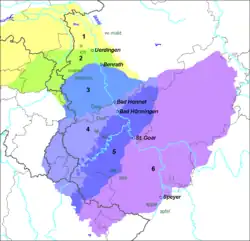 - au sens le plus large, il correspond au territoire appelé nördliches Moselfränkisch d'après le Rheinischer Fächer de Georg Wenker publié en 1877. Ce territoire est délimité par l'isoglosse dorp/dorf à l'ouest et par l'isoglosse op/of à l'est.