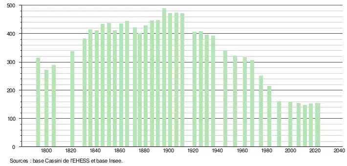 L'évolution du nombre d'habitants est connue à travers les recensements de la population effectués dans la commune depuis 1793. Pour les communes de moins de 10 000 habitants, une enquête de recensement portant sur toute la population est réalisée tous les cinq ans, les populations de référence des années intermédiaires étant quant à elles estimées par interpolation ou extrapolation[30]. Pour la commune, le premier recensement exhaustif entrant dans le cadre du nouveau dispositif a été réalisé en 2006[31].