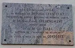- ↑ Philippe Mairot, « Lycée d'État de garçons, puis lycée Roosevelt, actuellement lycée Condorcet - Historique », sur Patrimoine en Bourgogne-Franche-Comté, (consulté le ).