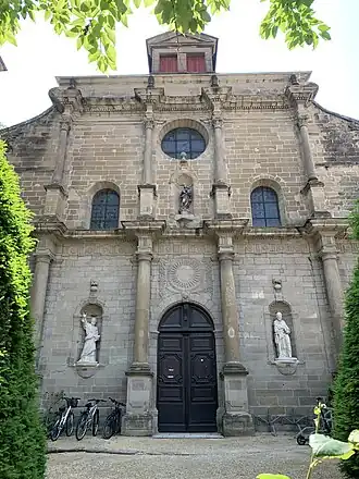 La façade est de style Jésuite classique (classicisme). Elle est réalisée en molasse, ce qui lui confère sa couleur. Elle est très élégante avec ses colonnes doriques à la base, composites au sommet.