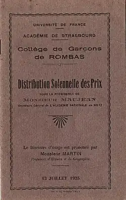 - ↑ (Sans auteur), Collège municipal de garçons de Rombas, fascicule imprimé (24p.) en 1938 par l'association des parents d'élèves