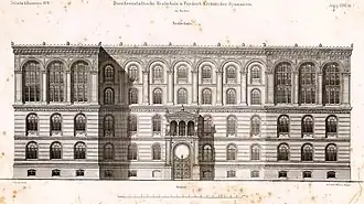 L'école est reprise par la ville de mains privées en avril 1836. Le bâtiment se trouve d'abord sur la Dorotheenstrasse, puis sur la Georgenstrasse 23. L'école est promue école secondaire de première classe, ce qui la considère comme une « école supérieure » et conduit à l'Abitur à partir de 1840. Elle perd temporairement ce statut jusqu'à ce qu'elle le retrouve finalement en 1861. Les premiers directeurs connus sont Ferdinand Zinnow (de) de 1836 à 1846[1] et Adolf Ferdinand Krech (de) de 1846 à 1856[2]. L'un des professeurs les plus connus est le professeur d'histoire John William Pierson (de), qui y enseigne de 1859 à 1893[3]. Les travaux d'un nouveau bâtiment scolaire sur les terrains de la Dorotheenstrasse 13/14 et de la Georgenstrasse 30/31, qui abrite finalement le lycée de Friedrichswerder, durent de 1870 à 1875[4]. Hermann Blankenstein est responsable de la construction de l'école double[5]. Le concept global vient de l'inspecteur municipal Arnold Hanel. Alors que les façades de l'école de la Georgenstrasse sont l'œuvre de l'ingénieur en construction Karl Theodor Richard Bohn, celles de la Dorotheenstrasse remontent à Blankenstein[6].