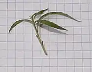 Les feuilles solitaires ou fasciculées sont lancéolées ou longuement elliptiques, de 2-3 cm de long sur 3-6 mm de large[8].