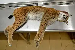 Les lynx sont très peu vecteurs de la rage. Sur mille lynx de Slovaquie capturés ou tués sur dix ans, seuls 0,6 % étaient infectés par le virus rabique. De plus, les lynx ne développent pas la forme agressive de la maladie et ont tendance à faire diminuer les populations de renards (très sensibles à la rage) par pression de prédation[26]. Cependant, les décès par maladie ne représentent qu'un quart des décès totaux. Les trois-quarts des décès des adultes sont dus à l'activité humaine, soit par une pression de chasse et/ou de braconnage, soit par le trafic routier. Pour les jeunes, c'est avant tout la famine et les maladies parasitaires qui déciment les populations : jusqu'à 80 % des jeunes n'atteignent pas l'âge de procréer[36]. Les lynx ont assez peu de prédateurs naturels en dehors de l'homme. L'ours brun et le loup gris peuvent attaquer et tuer un lynx[37]. La longévité est d'une quinzaine d'années dans la nature et d'environ trente ans en captivité[34].